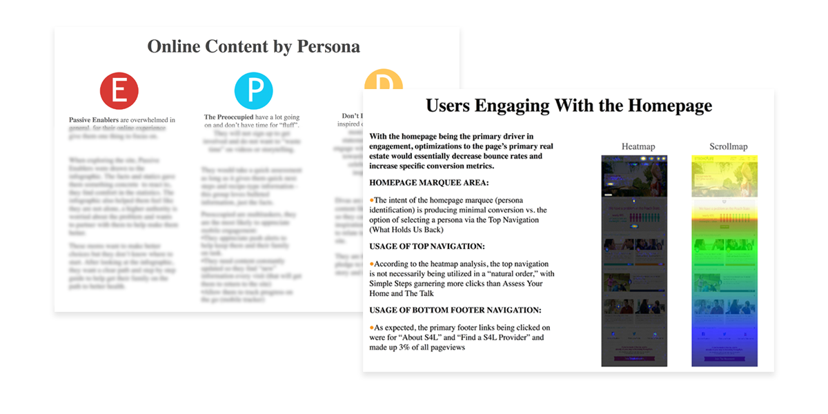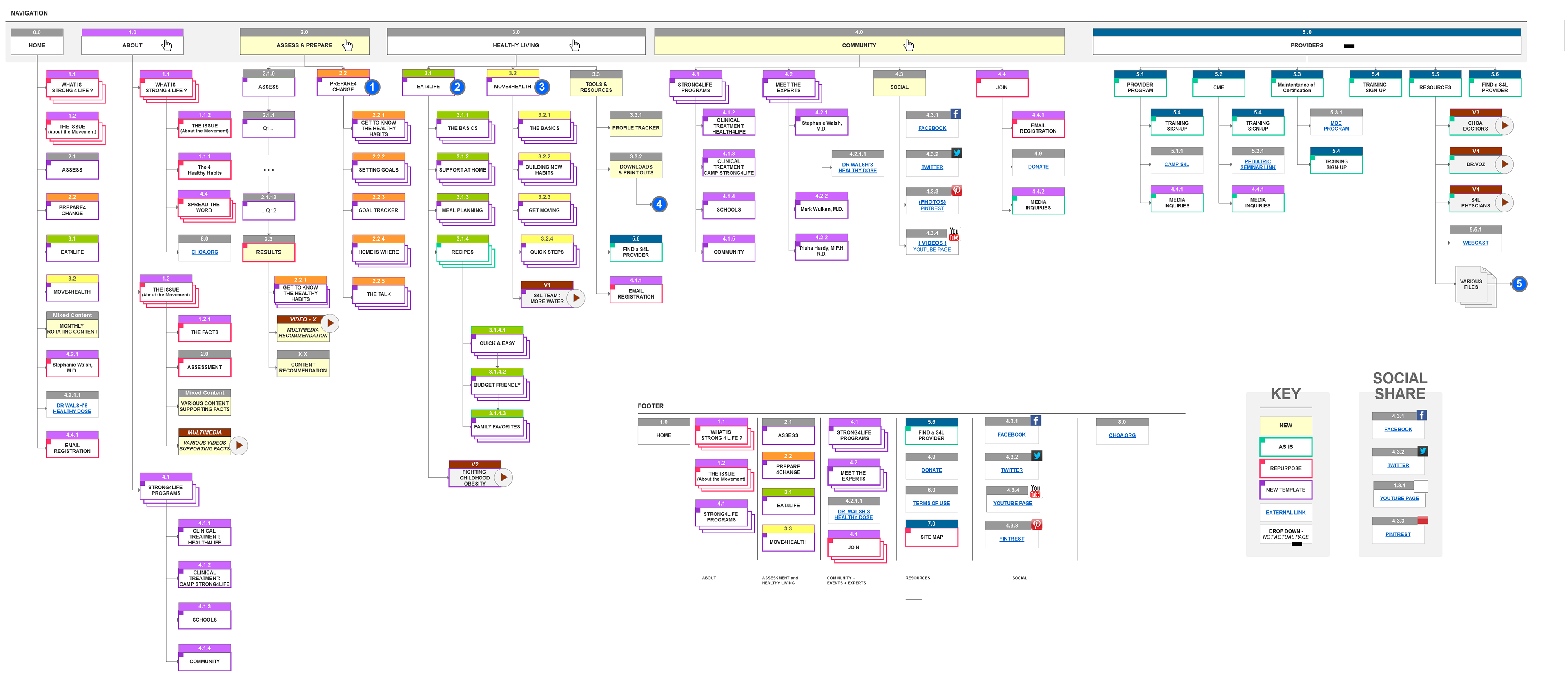 I started the project by reviewing all of the pages in the current website, and classifying the content into navigation categories that aligned with 5 Steps of Behavior Change.